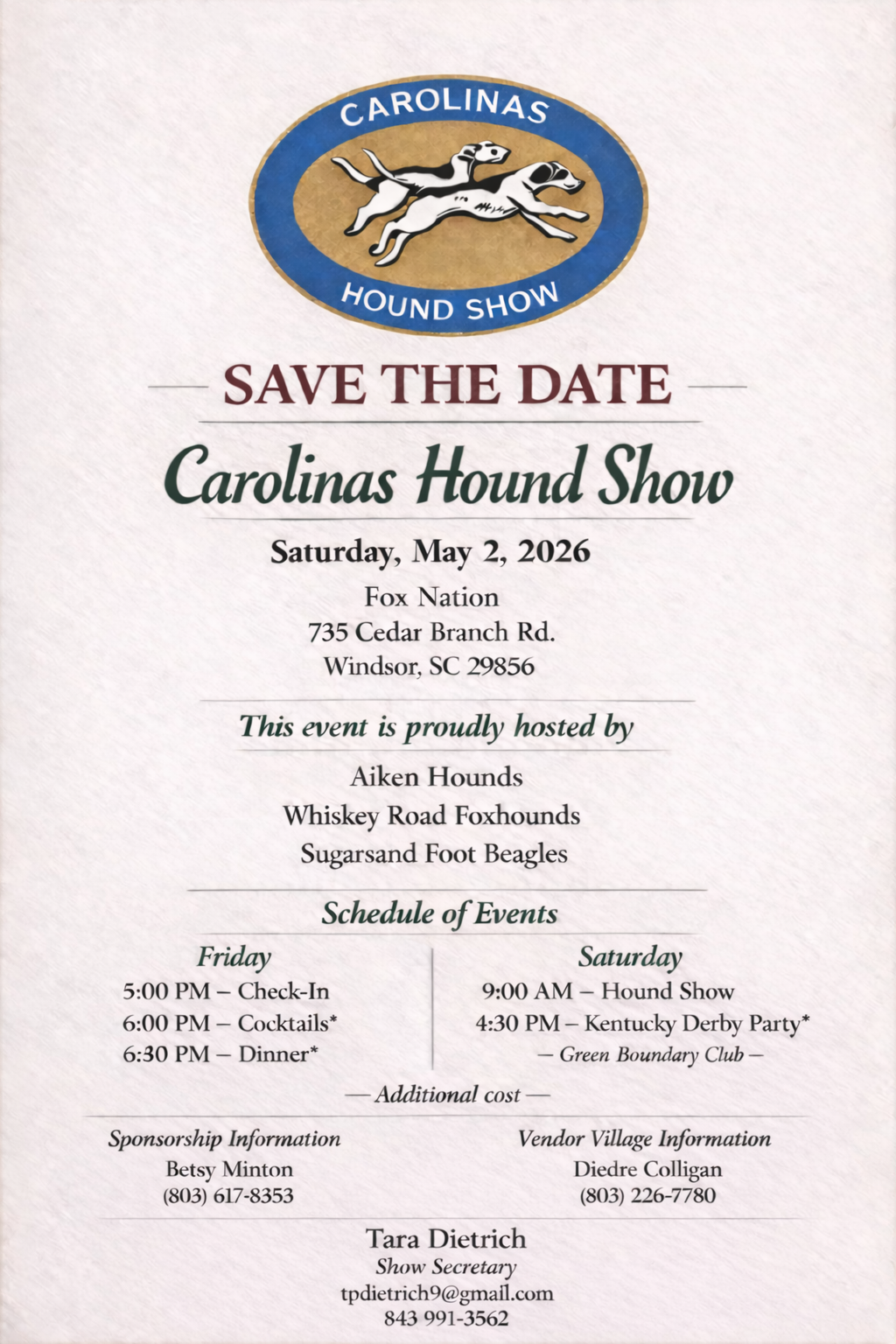 Carolinas Hound Show Check-in: Friday afternoon, May 1st Show: Saturday, May 2nd from 9:00 am-3:00 pm Location: Fox Nation, 735 Cedar Branch Rd. Windsor, SC 29856 Hosted by Aiken Hounds and Whiskey Road Foxhounds + Add to Google Calendar + iCal / Outlook export Date May 02 2026 Time All Day Category Hound Show Share this event
