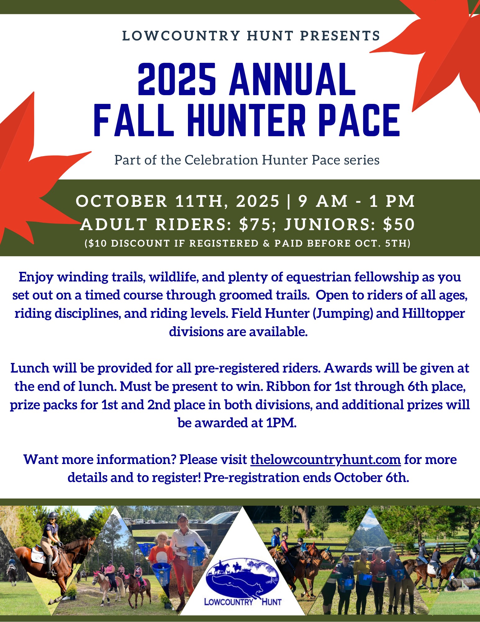 Lowcountry Hunt 2025 Annual Fall Hunter Pace + Add to Google Calendar + iCal / Outlook export Date Oct 11 2025 Time All Day Share this event